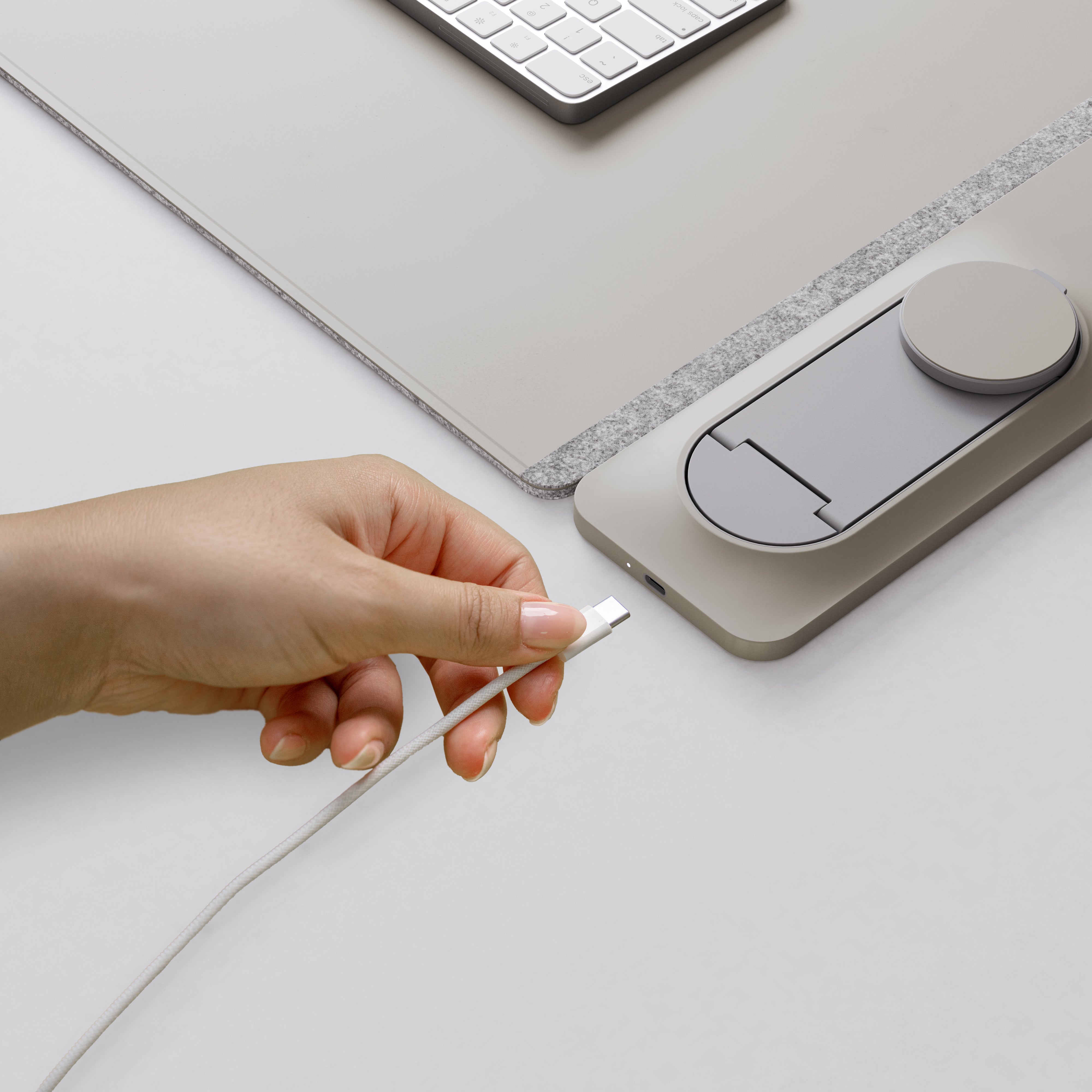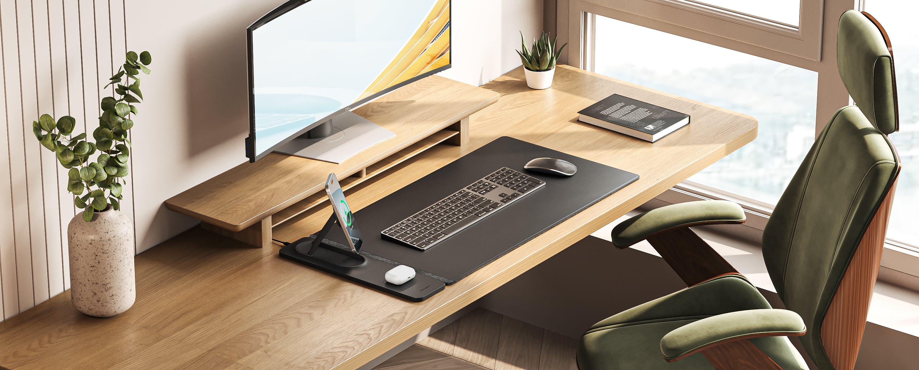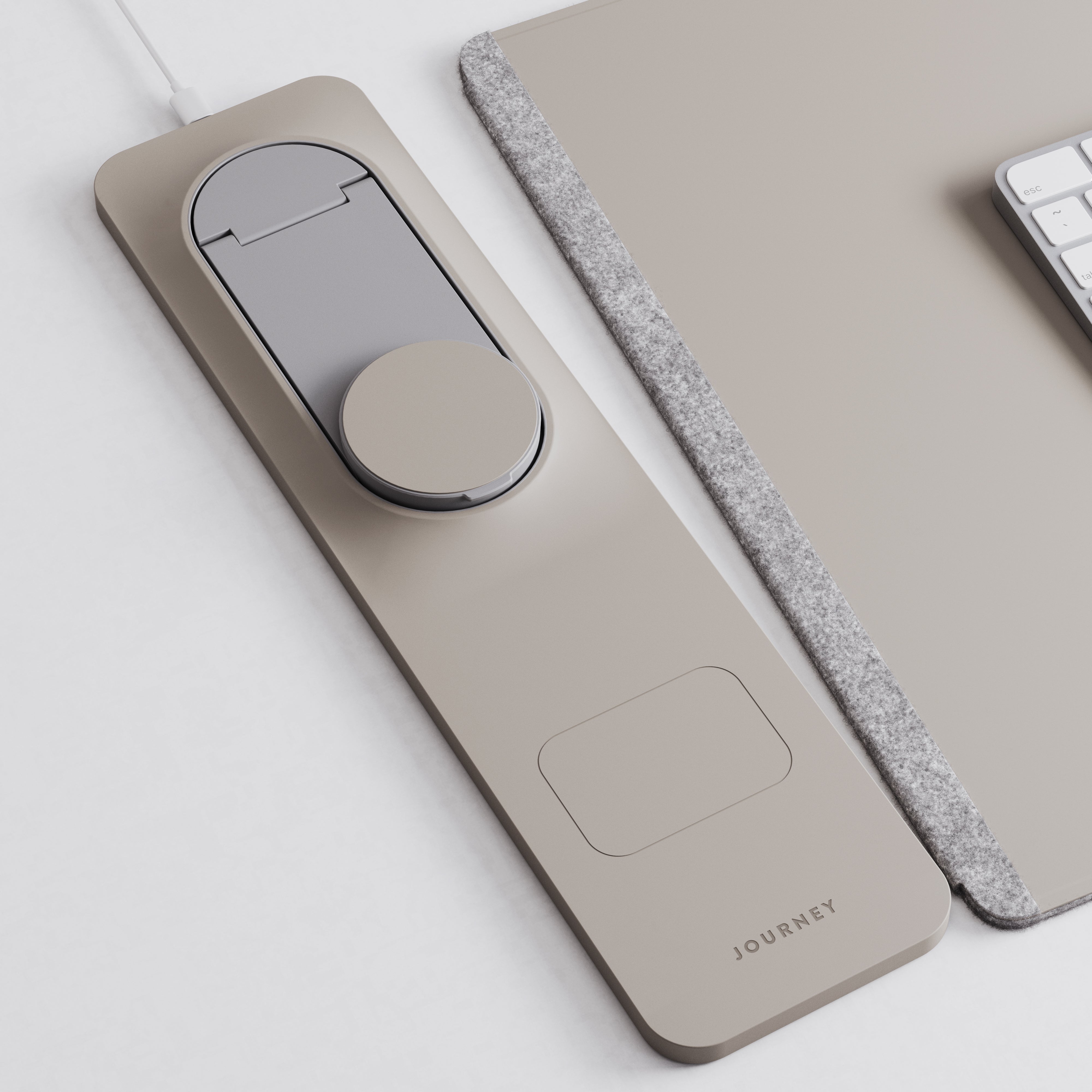 Dedicated space for keyboard/mouse and a magnetic panel that fast-charges phone (adjustable stand) and earbuds.