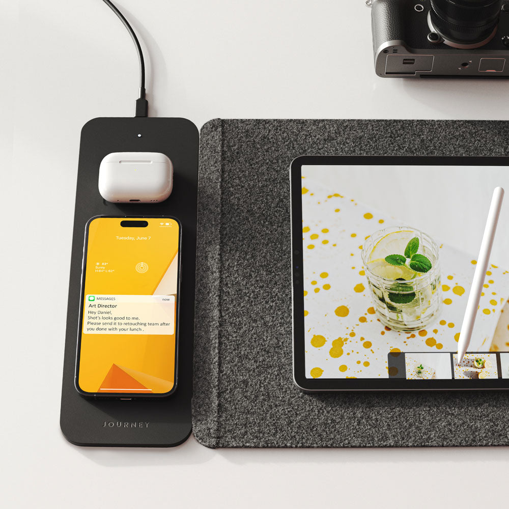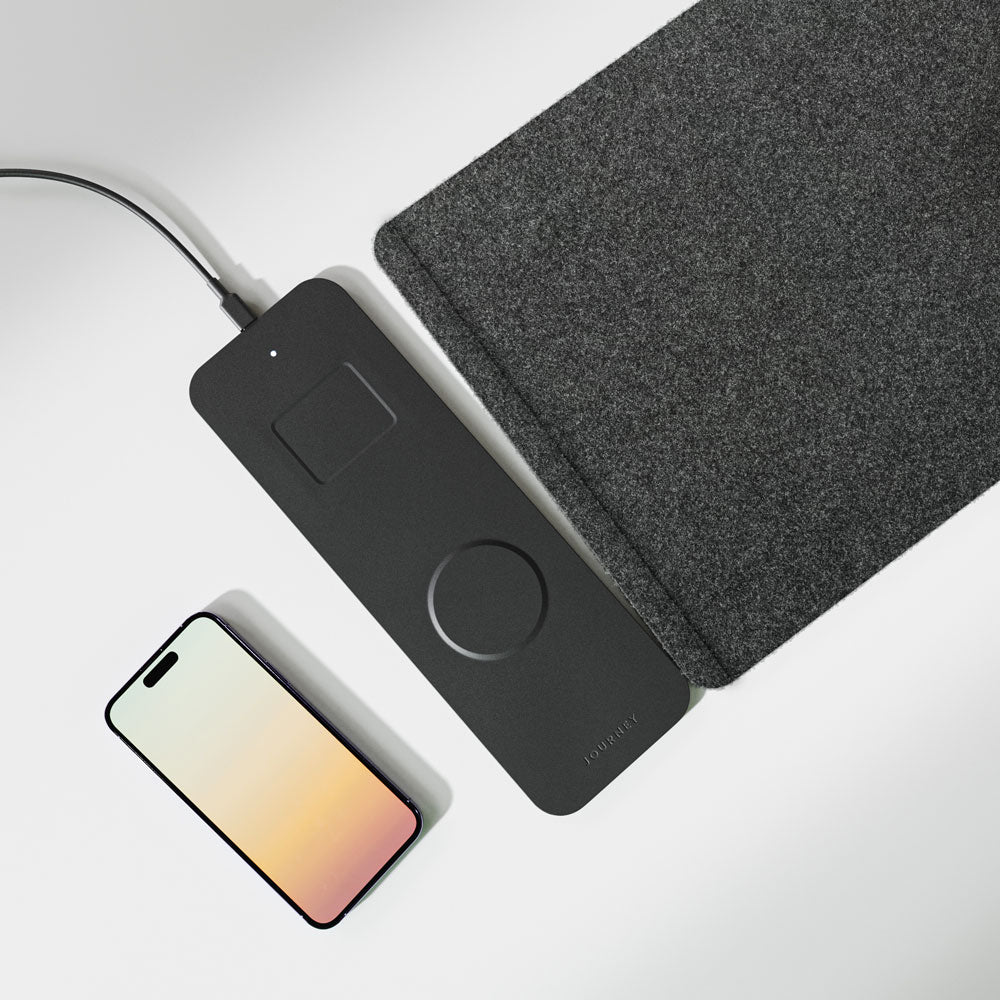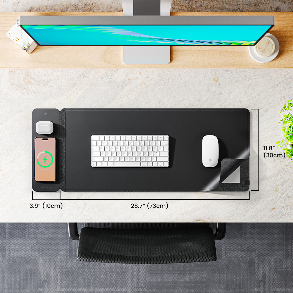 Reversible Desk Mat with a detachable wireless charging panel that fast charges your smartphone and earbuds simultaneously. Features water-resistant vegan leather on one side and plush felt on the other side.