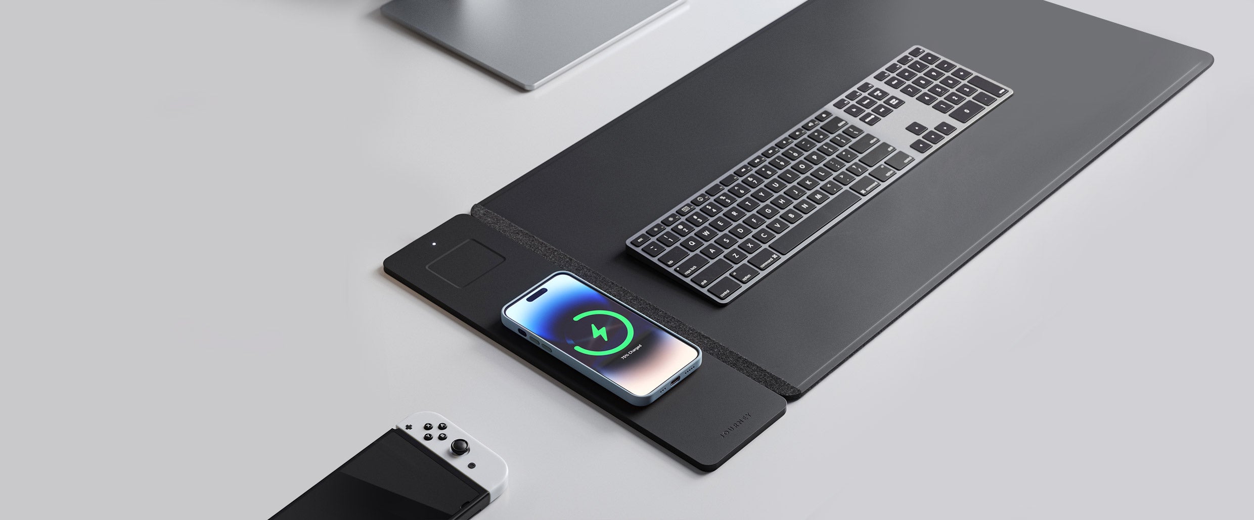 Reversible Desk Mat with a detachable wireless charging panel that fast charges your smartphone and earbuds simultaneously. Features water-resistant vegan leather on one side and plush felt on the other side.