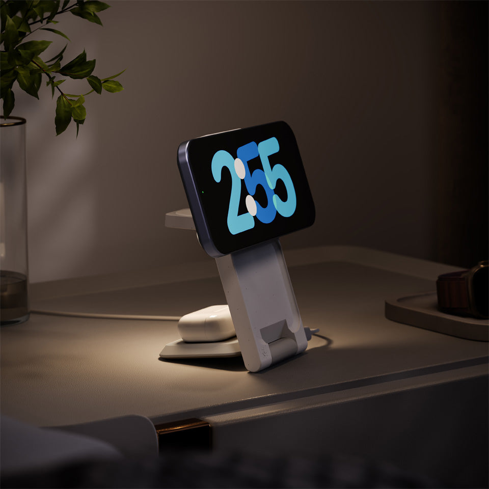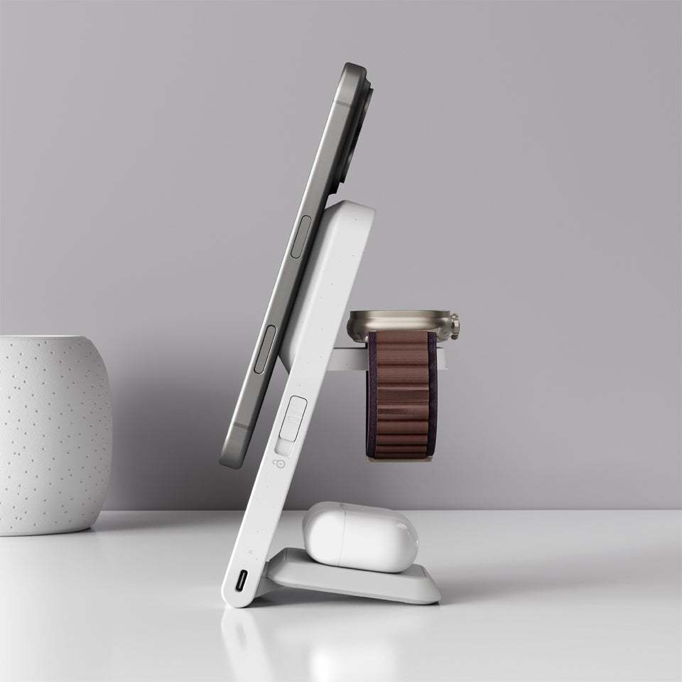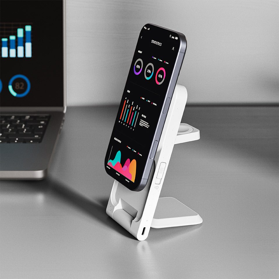 ARIA is a 3-in-1 fast wireless charging station for your Apple devices. Charge your iPhone (12 series and newer), Apple Watch (all models), and AirPods (wireless charging enabled) simultaneously—up to 15W for phones, fast charging for Apple Watch, and 5W for earbuds. It features a foldable design with a touch-controlled ambient light, making it ideal for both home and travel use.
