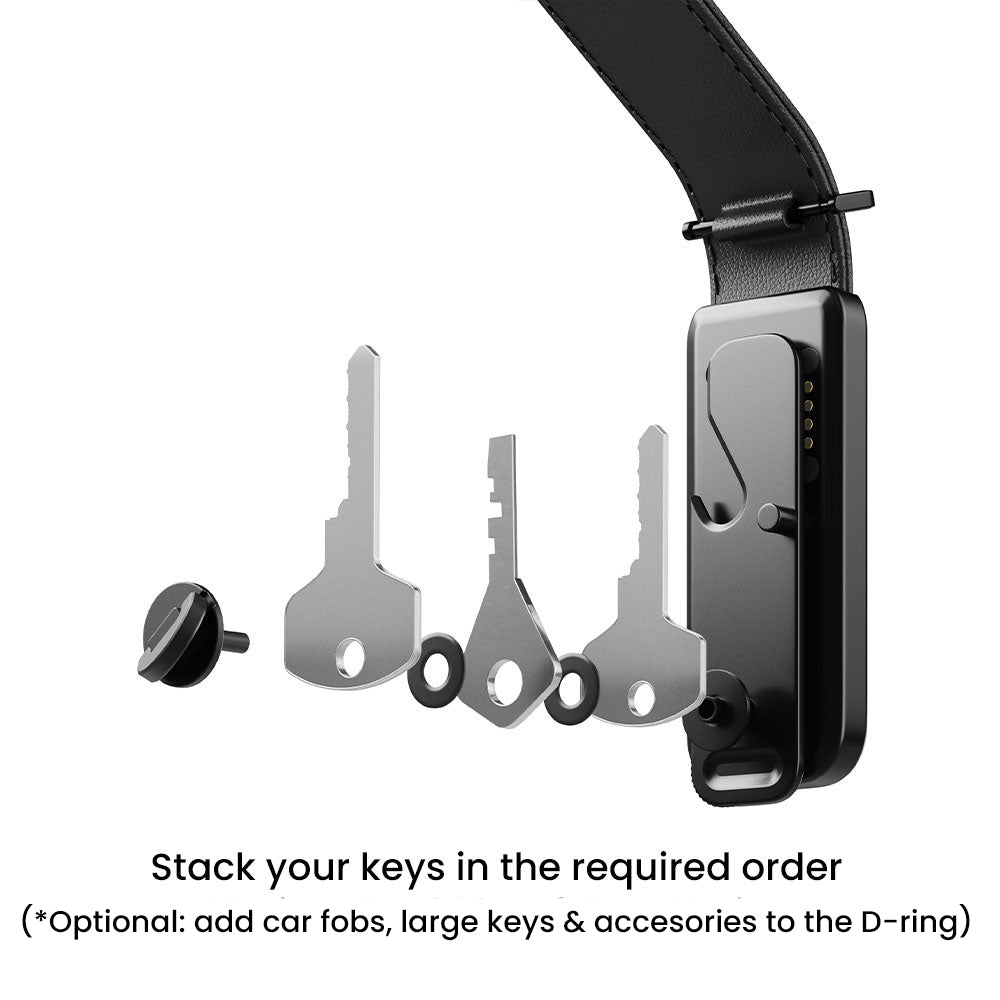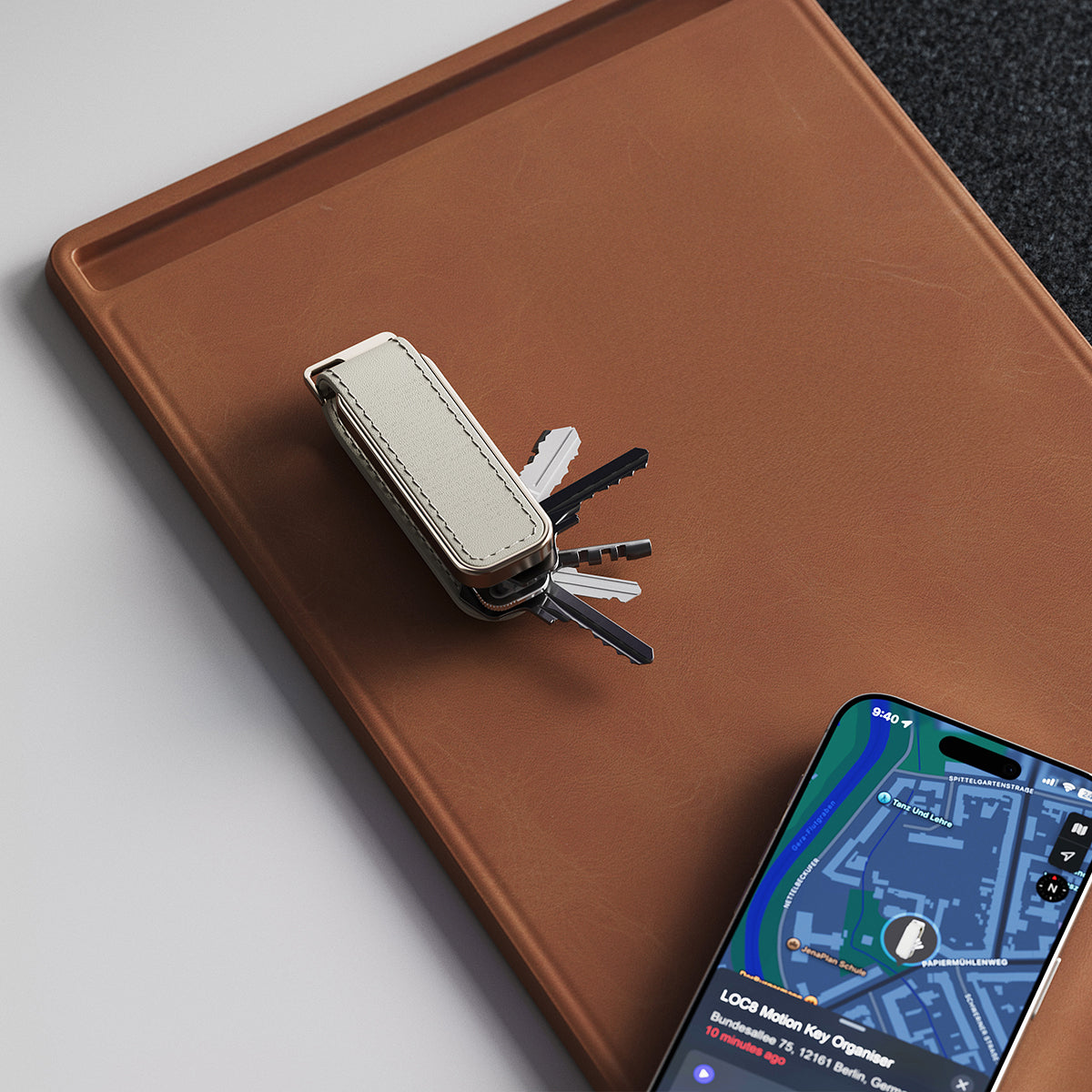 A. The LOC8 URBAN includes a key ring that you can attach to its D-ring. You can attach a fob or an remote electronic key case to the keyring.