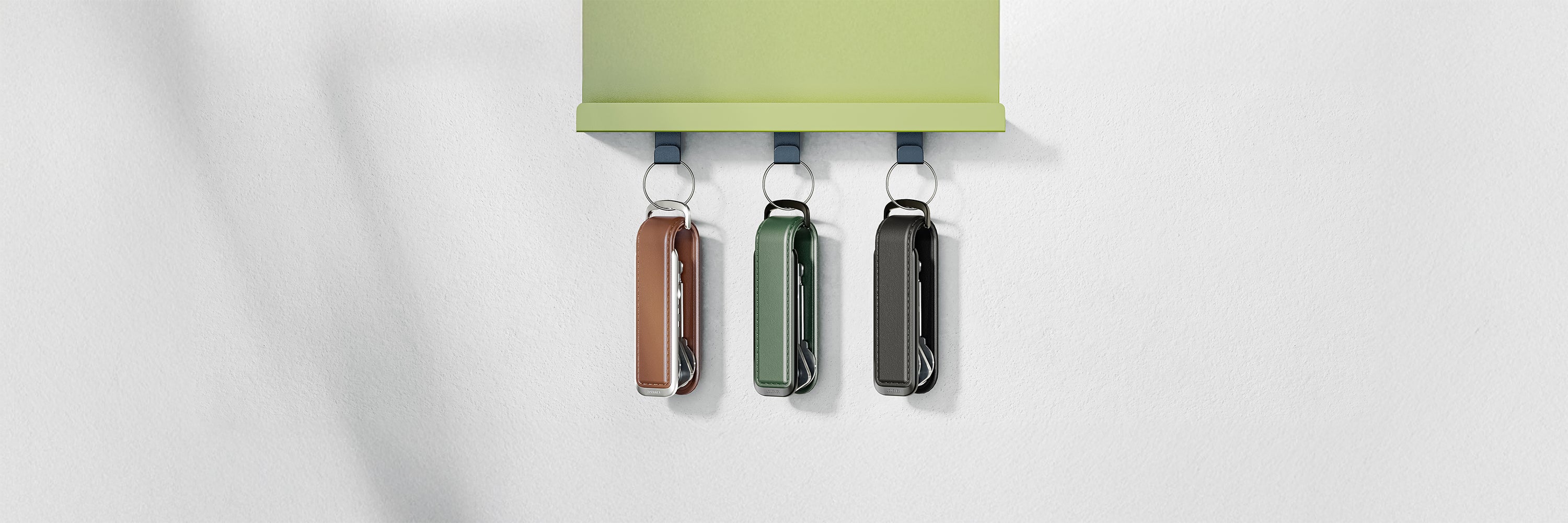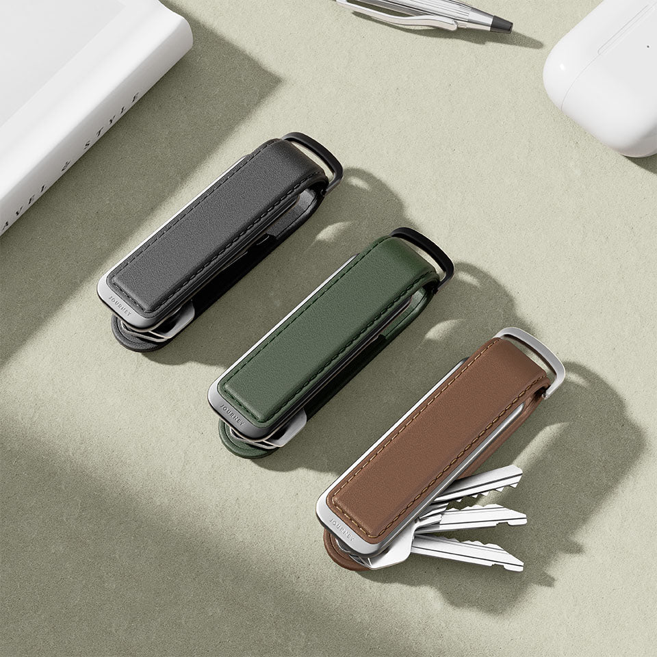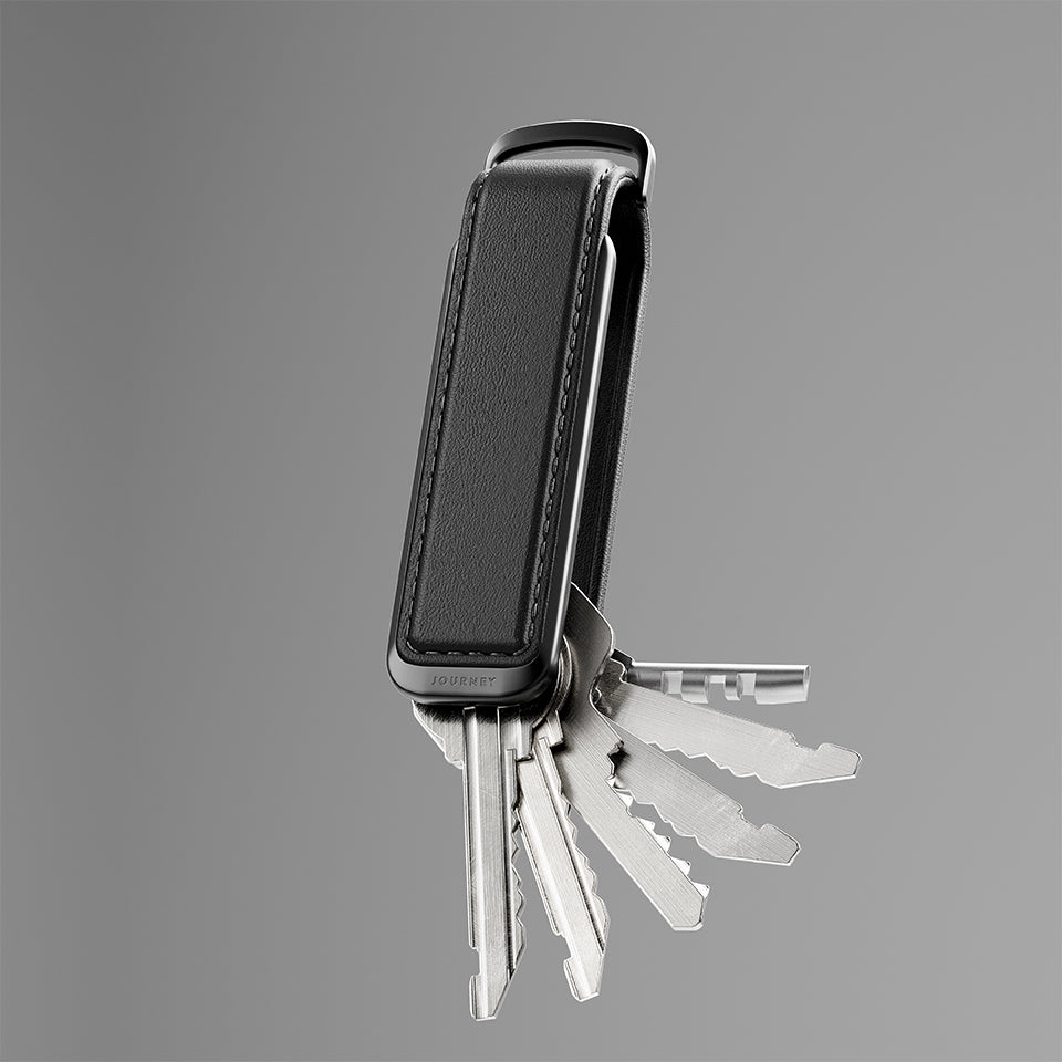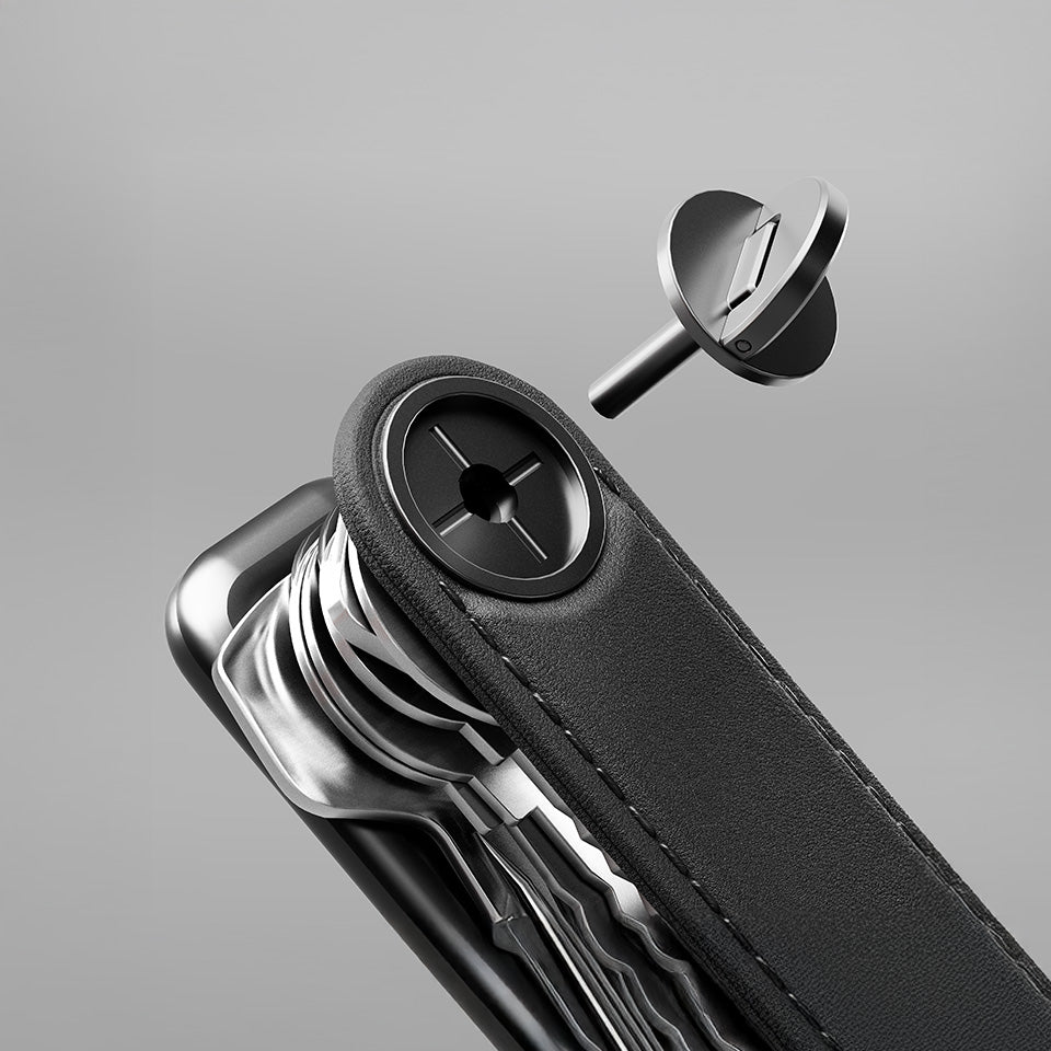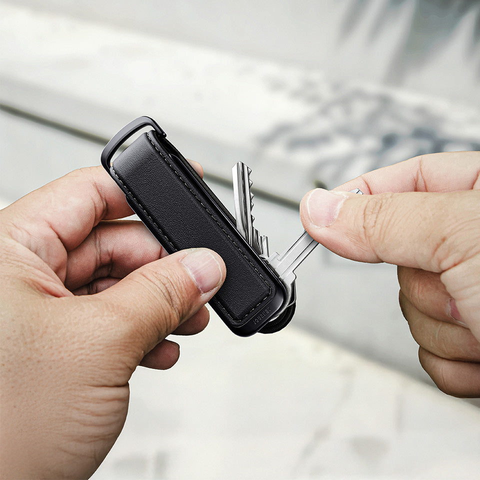 A minimalist key organizer made with Nappa leather and stainless-steel hardware. It stores up to six flat keys in a compact, silent stack and eliminates key jingling.
