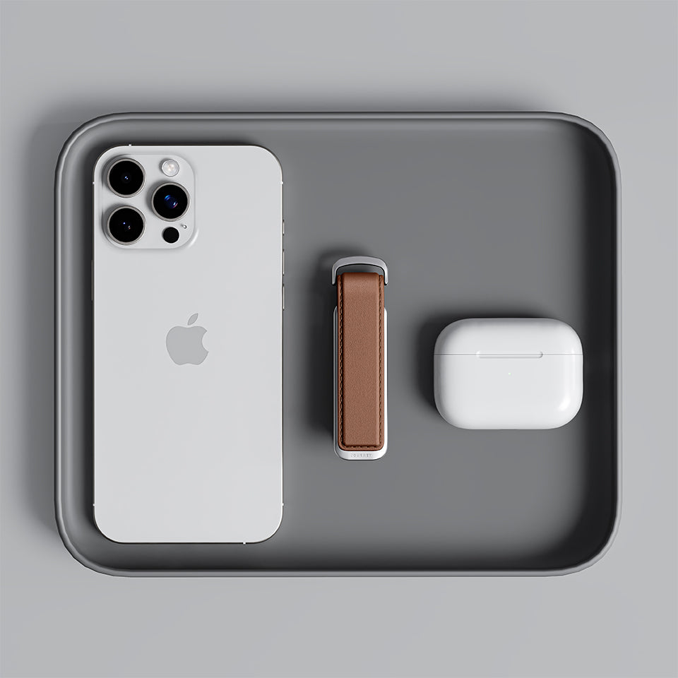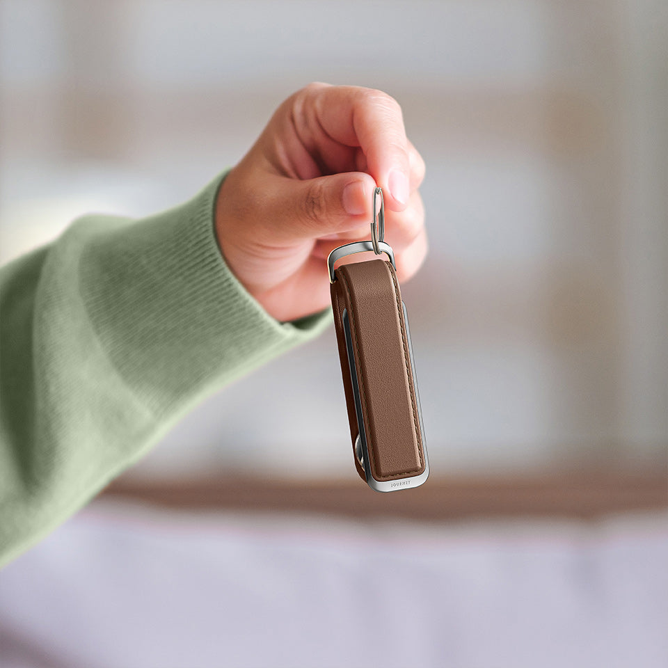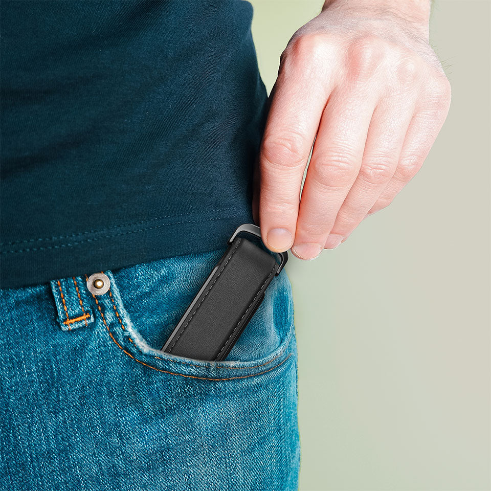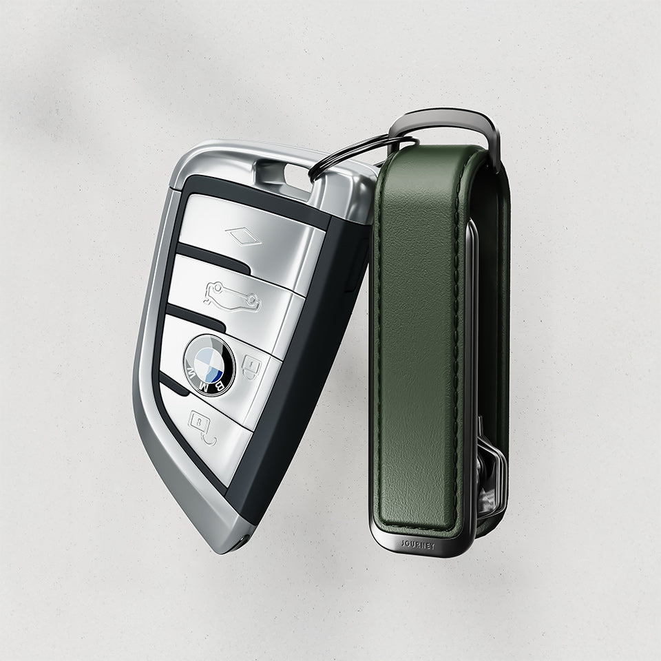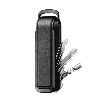 A minimalist key organizer made with Nappa leather and stainless-steel hardware. It stores up to six flat keys in a compact, silent stack and eliminates key jingling.
