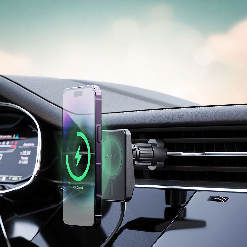 The EXPRESS Wireless Car Mount Charger with MagSafe is a safe and convenient way to keep your phone charged while driving. It features magnetic mounting that works with MagSafe-compatible iPhones, as well as other smartphones. The charger includes both a vent mount and a dash mount, so you can find the perfect spot for your phone. The charger delivers fast charging speeds of up to 15W, so you can keep your phone topped up even on long drives.