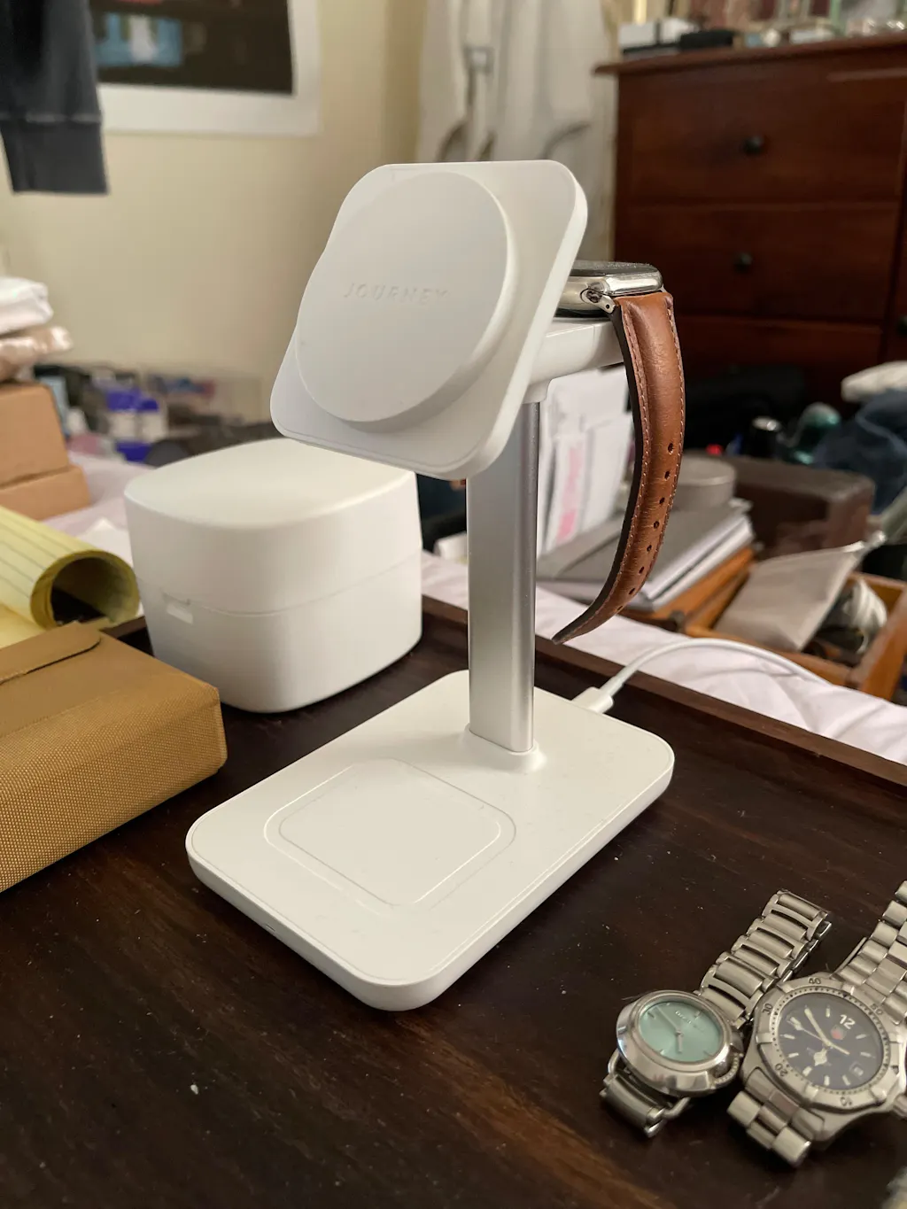 Simultaneously power your iPhone, Apple Watch, and Airpods/Pro with JOURNEY’S Rapid TRIO Wireless Charging Stand.