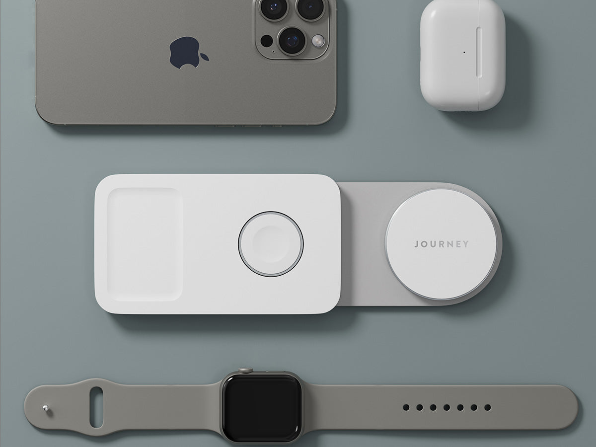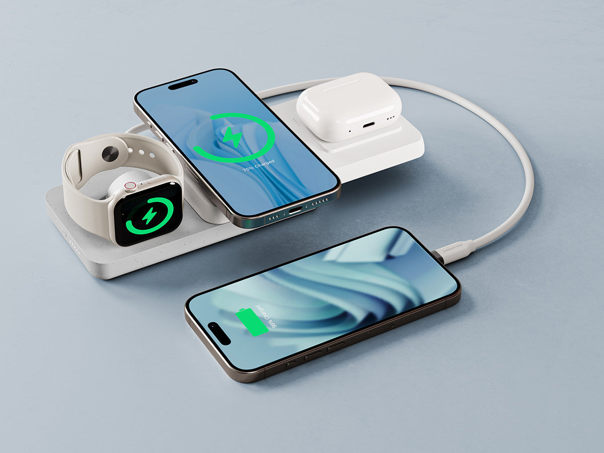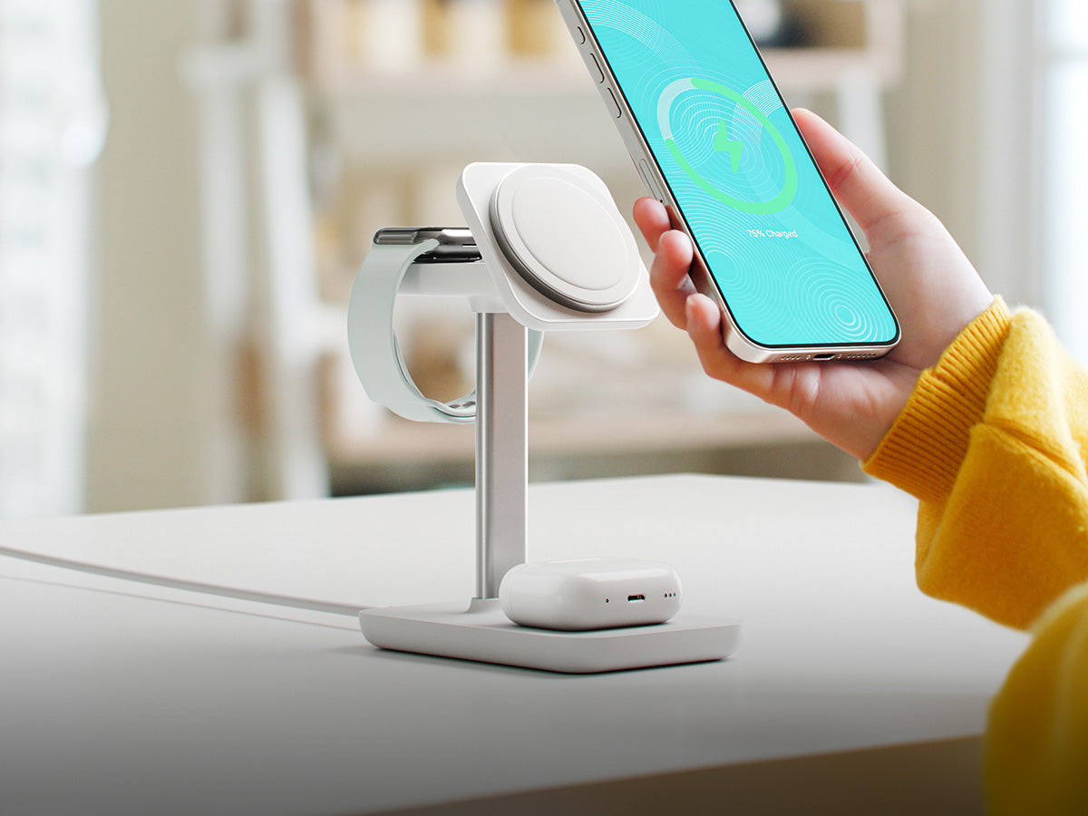 The RAPID TRIO Wireless Charging Stand simultaneously powers your iPhone/AirPods/Apple Watch. Simplify your charging routine with a speedy all-in one power solution that eliminates ugly cable clutter. The MagSafe-compatible RAPID TRIO, which also acts as a stand for your phone screen, offers maximum ergonomic support and single-handed operation.